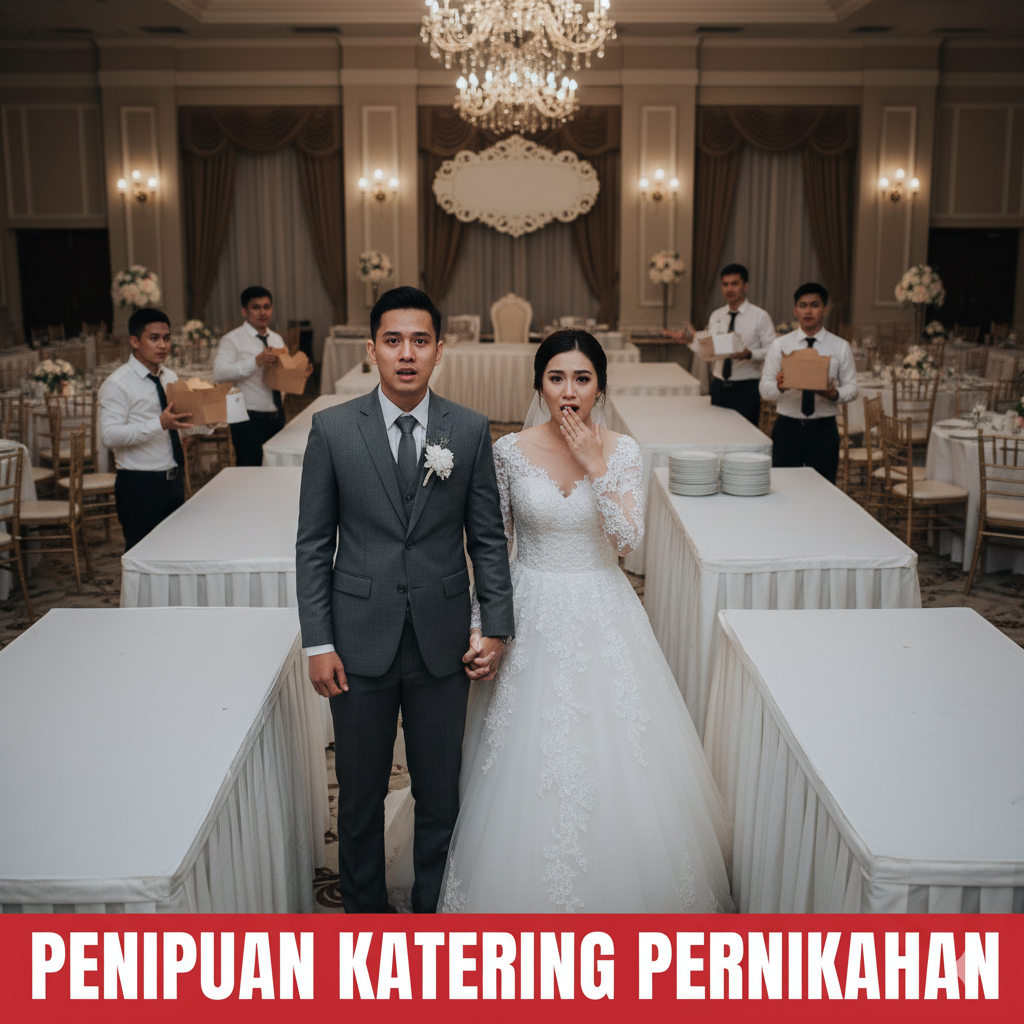 Duh gak kebayang dong kalau di hari bahagiamu malah kena tipu. Padahal hari pernikahan itu seharusnya menjadi hari terbaik yang bakal dirasakan satu kali dalam seumur hidup. Tentunya jadi sedih dan malu banget. Di saat tamu-tamu undangan yang udah pada datang, tapi pihak katering belum tampak sama sekali dan makanan belum ada yang dihidangkan. Kemudian kamu baru sadar jika telah kena tipu sama pihak katering tersebut.
